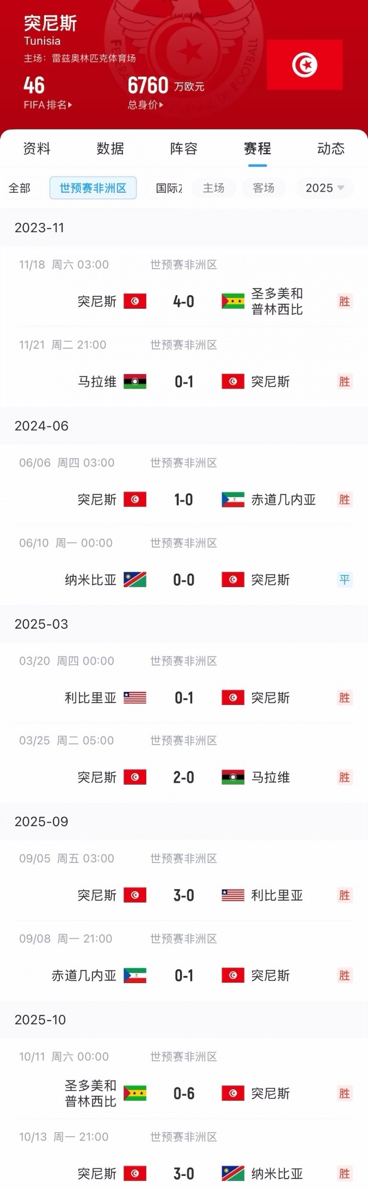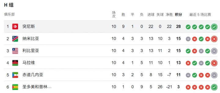在本階段世預賽中,突尼斯除了客戰(zhàn)納米比亞時0-0戰(zhàn)平,其他場次全部取勝且一球未失。
